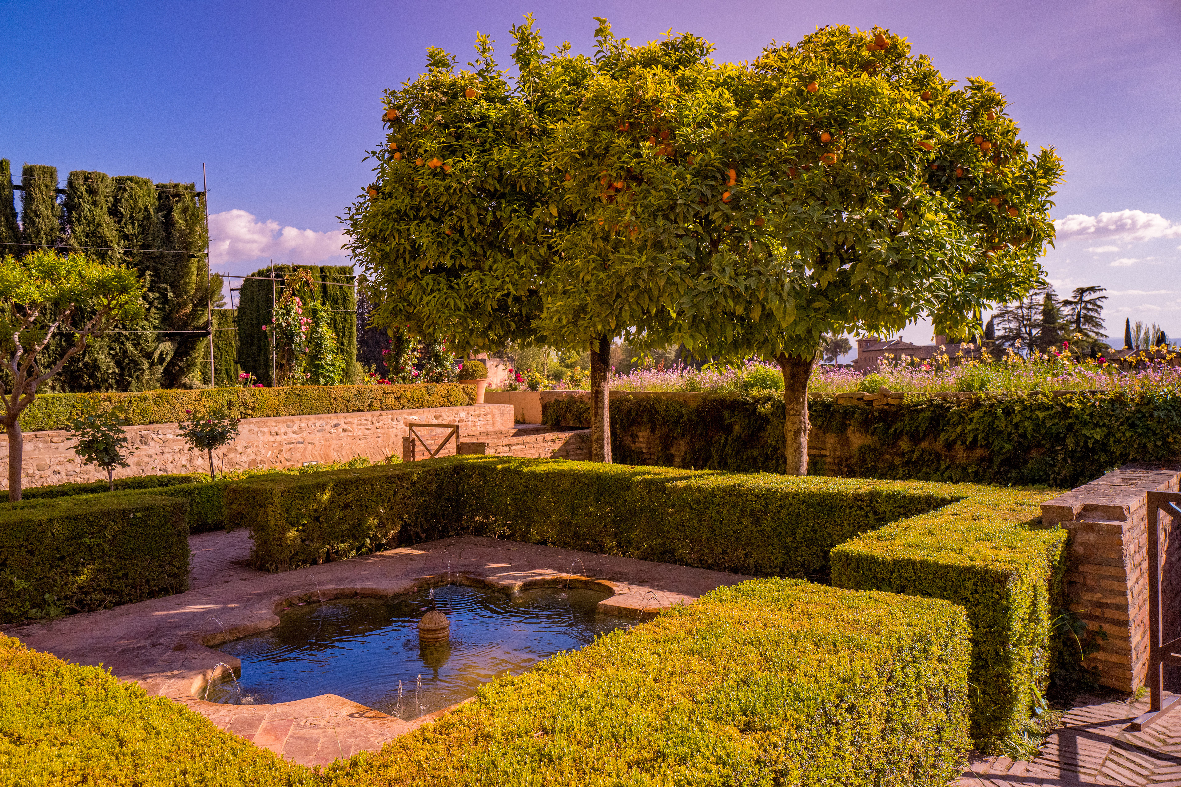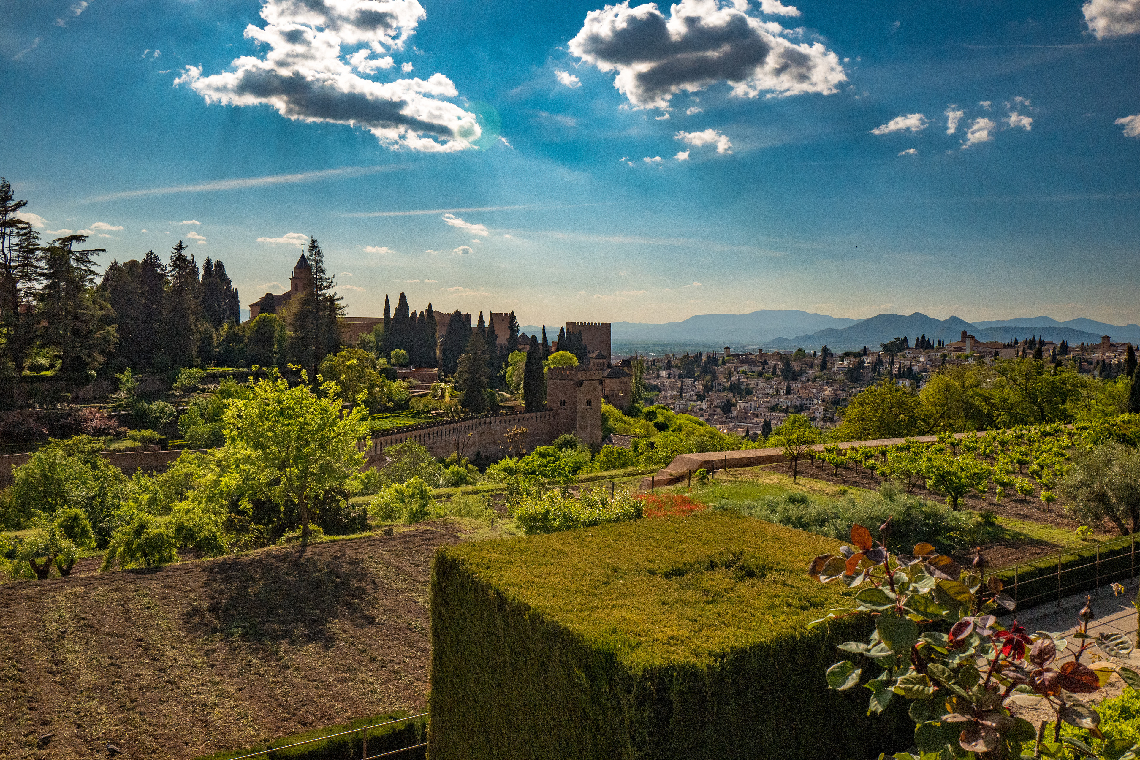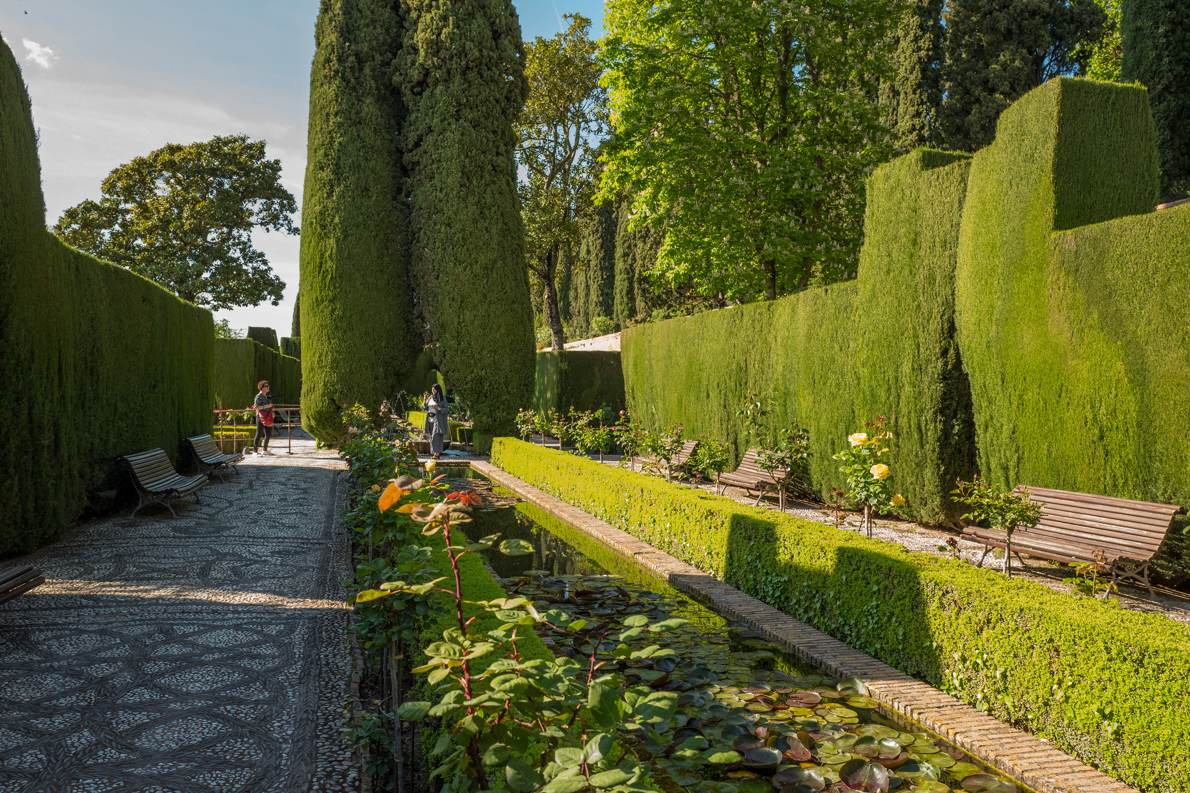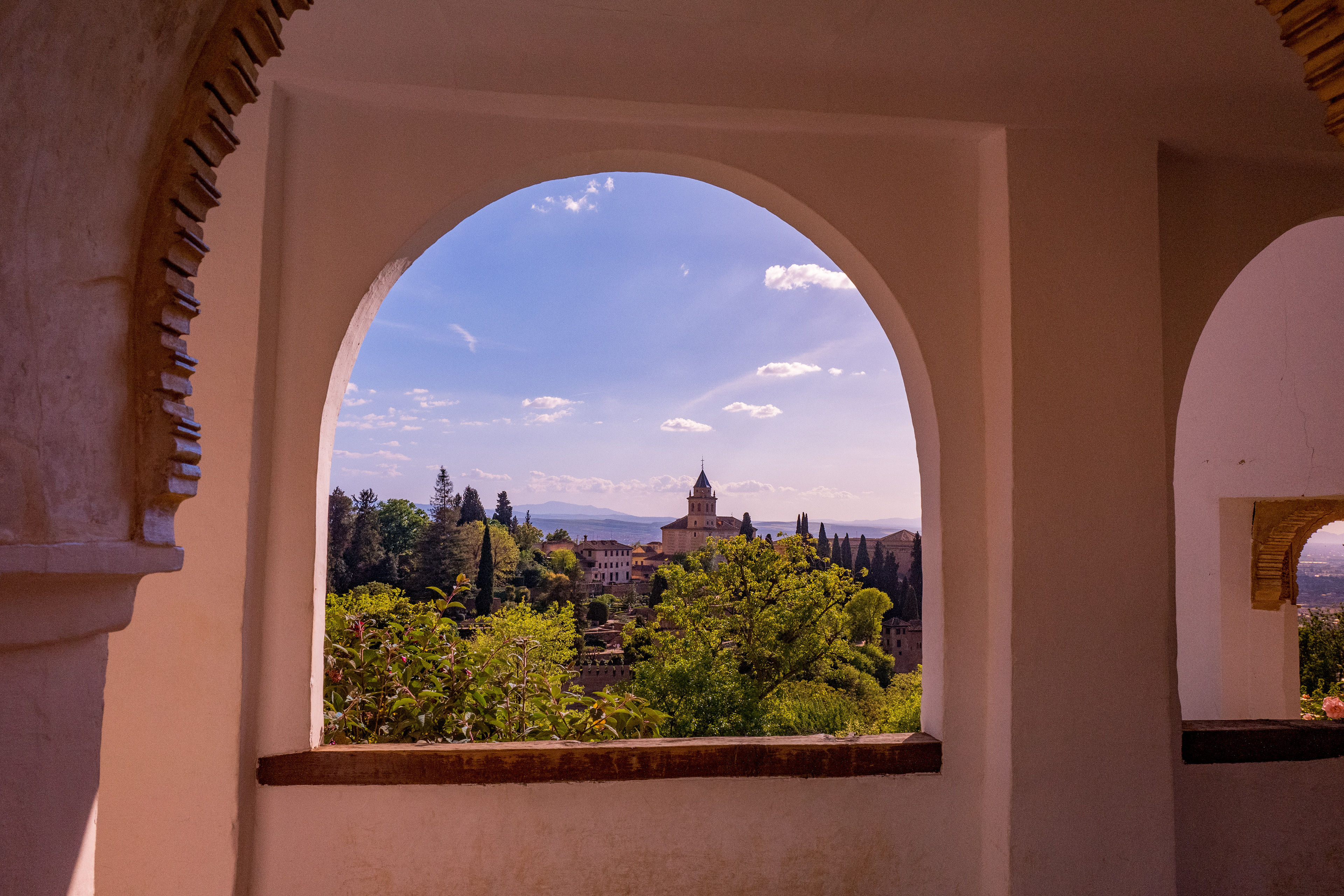 بالقرب من قصر الحمراء؛ وعلى بعد 1000م منه يوجد قصر جنة العريف، الذي شُيِّد في أواخر القرن السابع الهجري -الثالث عشر الميلادي-، ويقع شمال شرقي قصر الحمراء فوق ربوة مستقلة، ومن ورائه جبال الثلج،وقد غرست في ساحات القصر وأفنيته الرياحين والزهور الفائقة الجمال، حتى أصبح هذا القصر المثل المضروب في الظل الممدود والماء المسكوب والنسيم العليل، وقد اتخذه ملوك غرناطة منتزهًا للراحة والاستجمام.